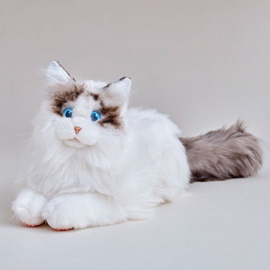 デザインモチーフはラグドール種の猫。穏やかで優しい表情、やや丸みを帯びたフォルム、光を反射してわずかに動く瞳など、「静かな存在感」を意識した仕上がりです。毛並みは長めの人工繊維で、本物の猫のような“撫でたときの反発感”を再現しています。抱きかかえたときの重量バランスも自然で、膝の上に乗せて撫でるだけで不思議な安心感が得られます。