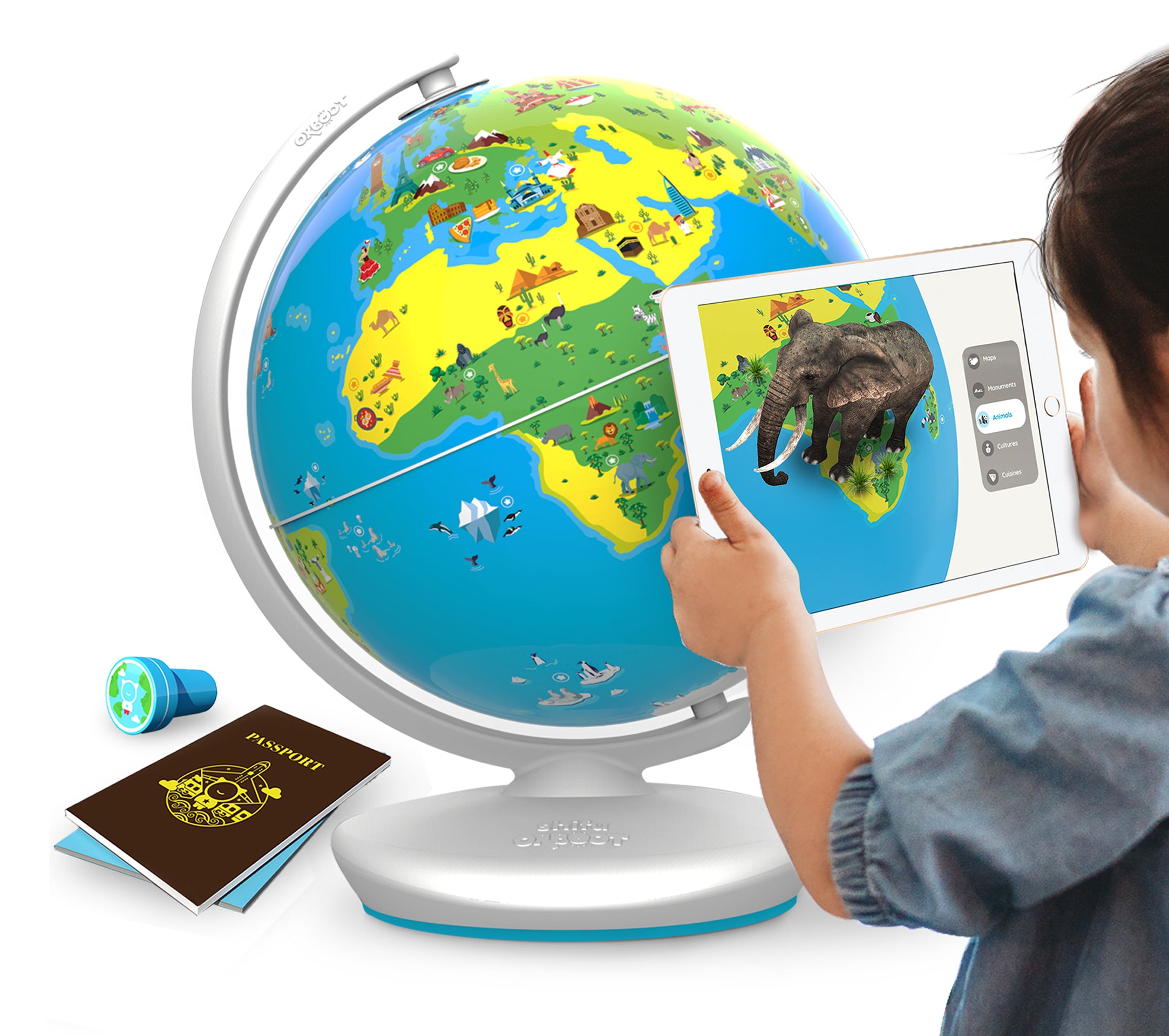 その代わりに、地球儀の表面には世界各地の文化や自然を象徴する小さなアイコンが散りばめられています。専用アプリをインストールしたスマートフォンやタブレットをかざすと、画面上にはそれらのアイコンから、まるで魔法のように3Dの野生動物、歴史的建造物、その土地の郷土料理などが立体的に浮かび上がります。