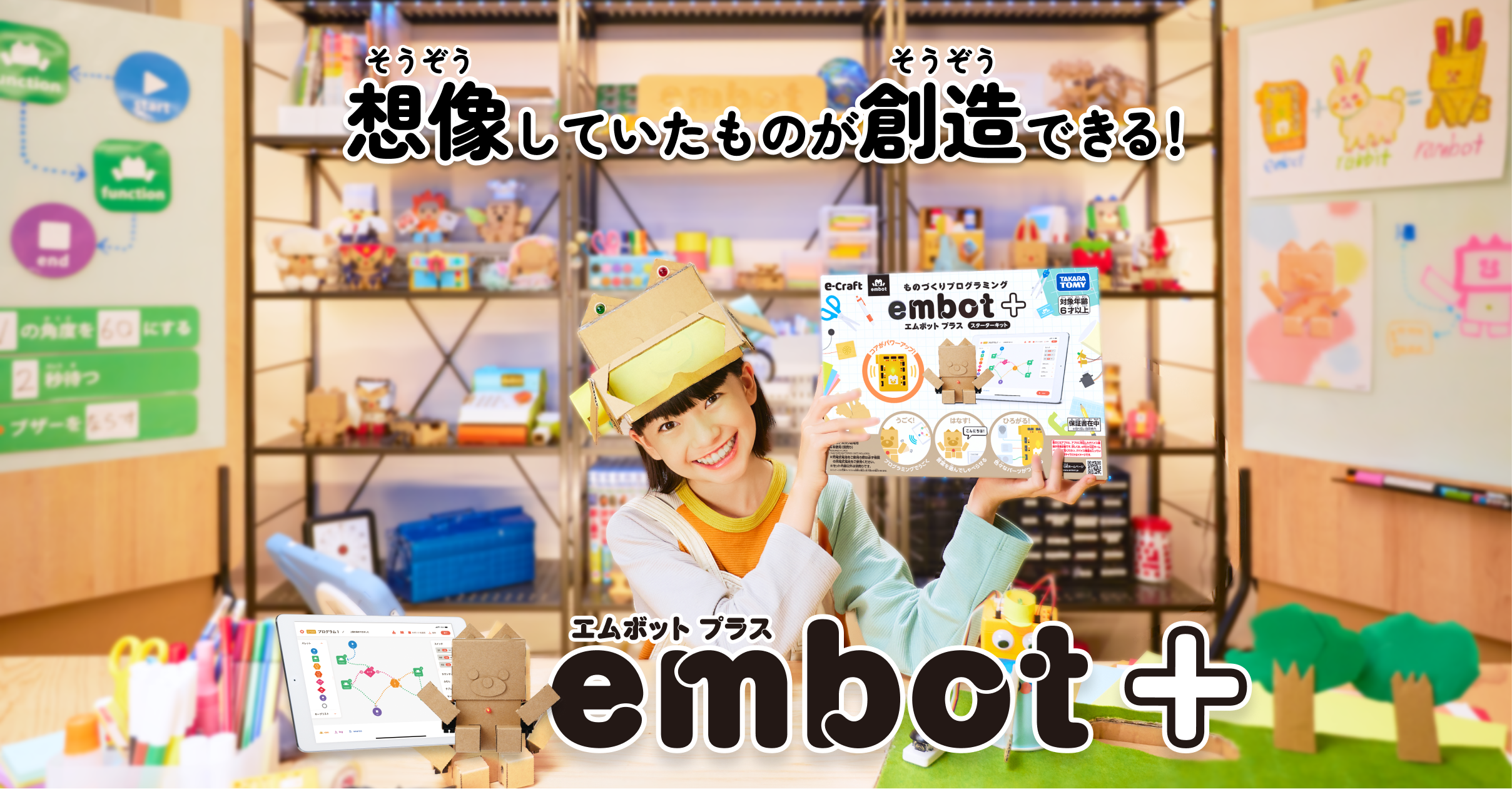 embot+ is the latest model of a robot kit for programming education developed by “e-Craft,” which was born out of NTT DoCoMo’s new business creation program. Its most distinctive feature is that the robot’s body is made of “familiar cardboard. Unlike commercially available finished robot toys, the process of assembling, decorating, and creating a one-of-a-kind original robot by the user is at the core of learning.