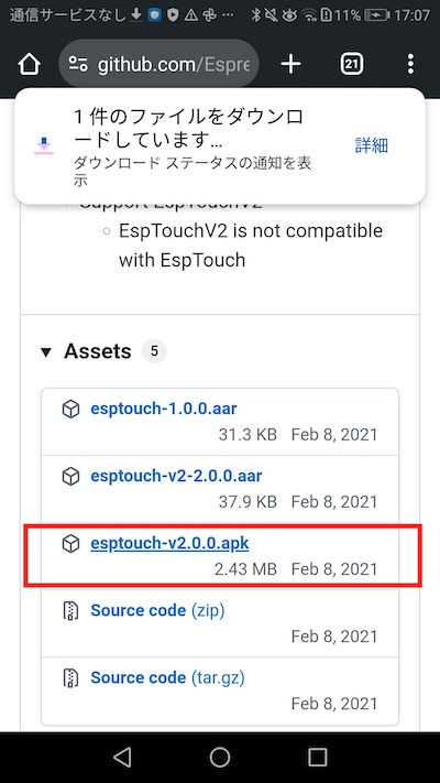 esptouch-v2.x.x.apkという名前のファイルをタップします(※zipやtar.gzはソースコードなので不要です)。- 「有害なファイルの可能性があります」と警告が出ることがありますが、公式ファイルですので 「続行」 または 「ダウンロードする」 を選択します。