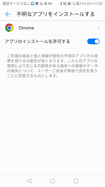 - 「不明なアプリのインストール」 の警告が出た場合は、「設定」 をタップし、「この提供元のアプリを許可」 をオンにします。
